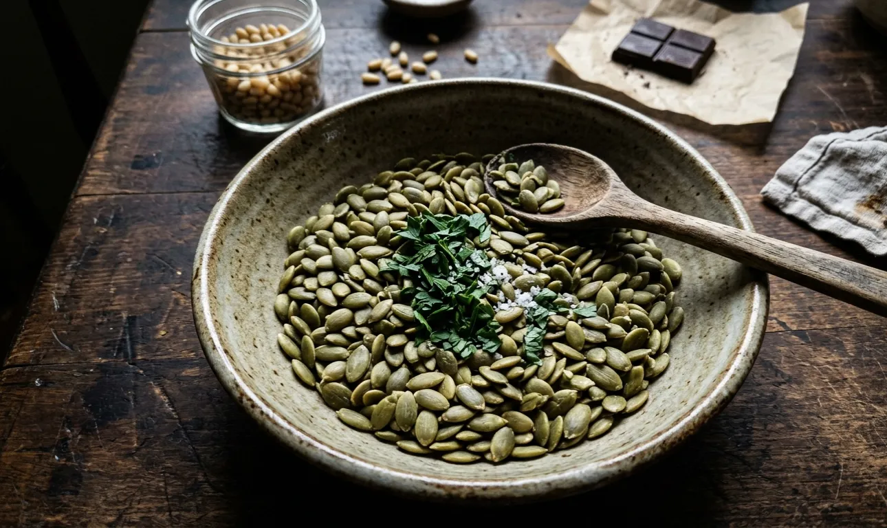 Strooide een handvol rauwe pompoenpitten over mijn ochtendpap