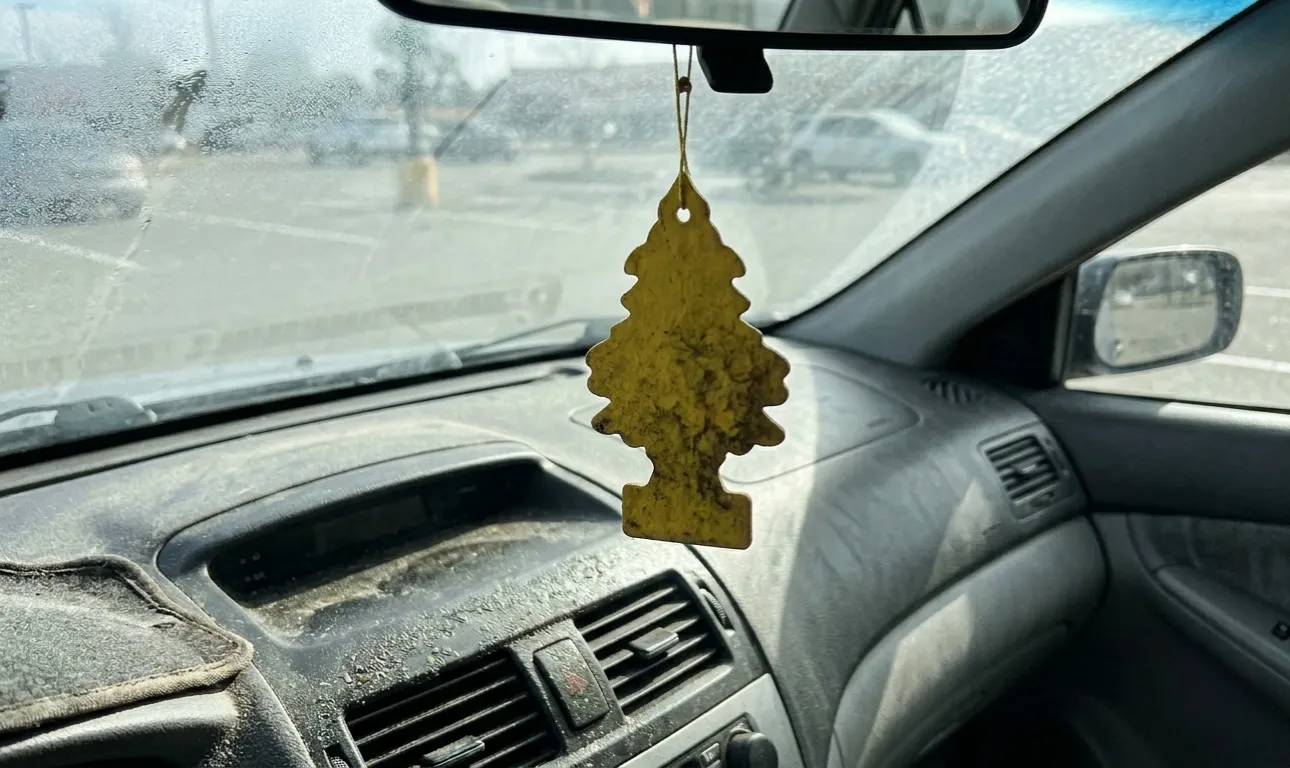 Ik heb lang geleden de penetrante parfums op mijn achteruitkijkspiegel opgegeven ten gunste van eenvoudige stoffen zakjes actieve kool, die zelfs in de diepste winterfiles goed werken.
