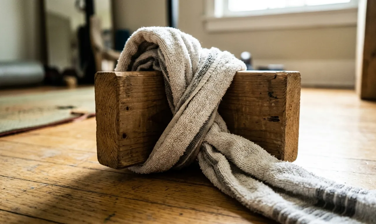 Om te beginnen wordt een strak gedraaide handdoek of een stijve stoffen riem gepakt.