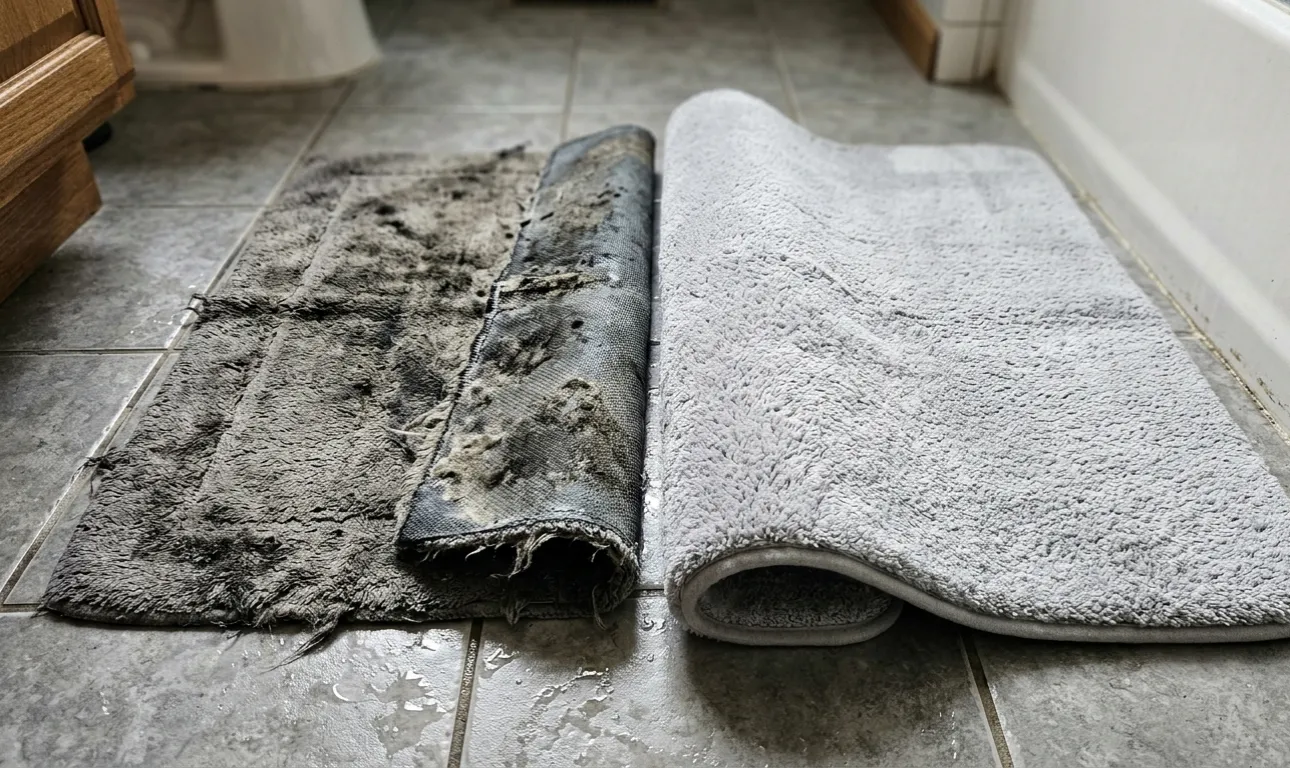 Een geheim: zelfs als een mat helemaal droog aanvoelt, verbergt de dikke rubberen achterkant vaak diepgeworteld vocht.