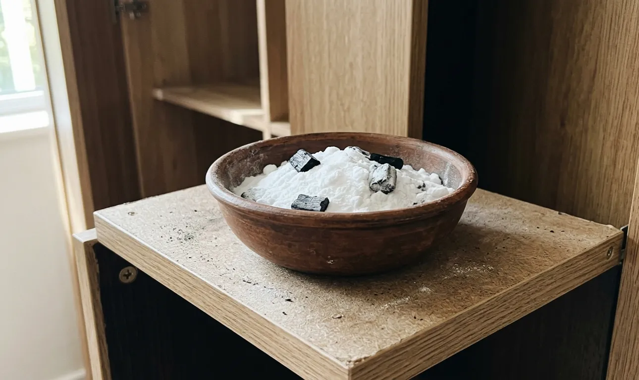 Plaats schoteltjes met zuiveringszout in hoeken van de kamer en in kasten